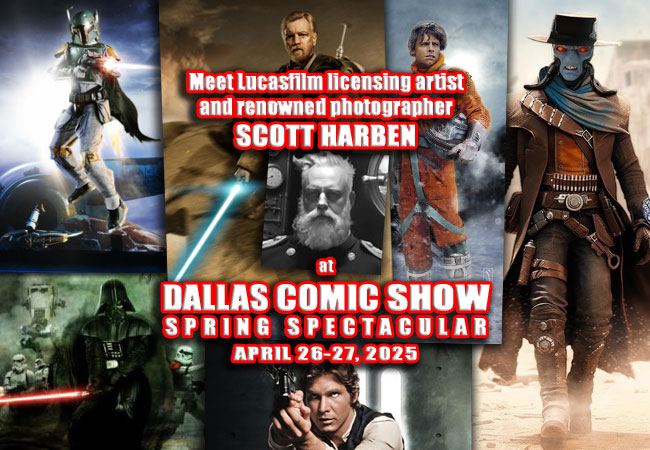His work has been seen on a wide variety of theatrical poster campaigns, including Robert Rodriguez’s SPY KIDS and THE PUNISHER. He’s also provided licensing art for Lucasfilm and STAR WARS products and advertising campaigns, and is considered my many to be one of the most respected photographers in the DFW area. Help us welcome Scott Harben to our growing guest list for DALLAS COMIC SHOW’s Spring Spectacular this April 26-27, 2025 at The Vista Mall in Lewisville! Scott’s work has also been featured at STAR WARS CELEBRATION, where he debuted exclusive art prints. He’ll be offering stunning art and prints at the show to fit every price point.