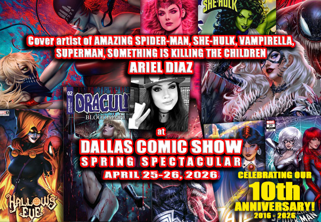 You’ve seen her amazing covers on books like THE BOYS, G.I. JOE, SOMETHING IS KILLING THE CHILDREN, TAARNA, VAMPIRELLA, VANISH, and more. She just recently turned in amazing cover art for SHE-HULK, HARLEY QUINN, AMAZING SPIDER-MAN and HALLOWS’ EVE to boot. She’s quickly become a fan-favorite among comic book collectors, and we expect you’ll be seeing her art more and more on HOT books in the next few years. Help us welcome back the very lovely and talented Ariel Diaz to DALLAS COMIC SHOW’s Spring Spectacular this April 25-26, 2026 at The Vista Mall (formerly Music City Mall) in Lewisville! Ariel’s covers are selling out left and right, and she’s someone you better buy some art or a print from now while it’s still doable. We love having her at our events, so don’t miss your chance to meet her in April.