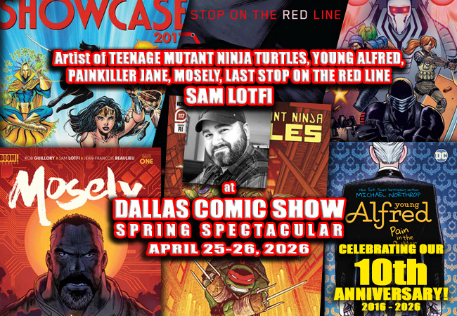 Sam Lotfi is a comic book creator & artist living in Austin, TX.  He’s best known for his co-created books MOSELY (Boom! Studios), ALFRED: PAIN in the BUTLER (DC Comics) and LAST STOP ON THE RED LINE (Dark Horse Comics) and TEENAGE MUTANT NINJA TURTLES covers (IDW) as well as other work for DC, IDW, Dynamite, 1First Comics & Antarctic Press. Sam’s artistic contributions include a variety of animated and video game projects, most recently the VR shooter SWARM 1 & 2. When he’s not at the drawing board, Sam enjoys building terrain and painting miniatures for various tabletop RPGs and war games.  You can find more of Sam’s work on Instagram @slotfi and SAMLOTFI.COM. We’re excited to have Sam join us for DALLAS COMIC SHOW’s Spring Spectacular this April 25-26, 2026!