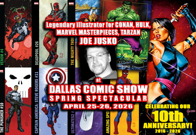 We’re thrilled to welcome the great Joe Jusko to DALLAS COMIC SHOW’s Spring Spectacular this April 25-26, 2026 …his last Dallas show was in 2023, and we’re very excited to have him join us for our 10th Anniversary! Joe has contributed stunning painted work to THE SAVAGE SWORD OF CONAN, VAMPIRELLA, TOMB RAIDER, PUNISHER, and more. His most impressive achievement has to be the instantly classic Marvel Masterpieces trading card collection, which to this day are some of the most popular and desired comic book trading cards ever made. He recently painted a whole new Master Masterpiece card set for Upper Deck, which showed he’s still a master with a paint brush, and his Marvel “Corner Box” variant covers are some of the most popular variants to be released in comic shops. Help us welcome Joe as our Guest of Honor for the list for April!