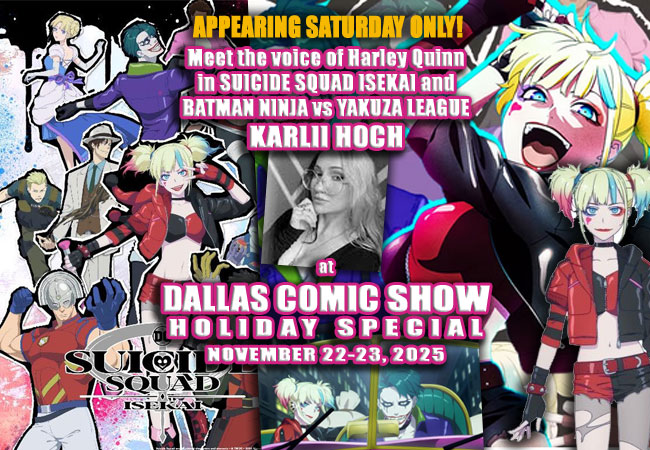 Karlii Hoch is an American voice actress affiliated with Sentai Filmworks. Known for work on Anime projects like RAGNA CRIMSON, ROCK IS A LADY’S MODESTY, FROM bUREAUCRAT TO VILLAINESS: DAD’S BEEN REINCARNATED!, FLOWER AND ASURA, CHAINED SOLDIER, DARK GATHERING and more. She recently took on the iconic role of the DC Comics character Harley Quinn in SUICIDE SQUAD ISEKAI and BATMAN NINJA vs YAKUZA LEAGUE. We’re very happy to have Karlii join us for DALLAS COMIC SHOW’s Holiday Special this November 22-23, 2025 at The Vista Mall in Lewisville! Let’s make sure to give her a warm welcome. PLEASE NOTE – Karlii is appearing on SATURDAY ONLY at the show, she is unable to attend on Sunday.