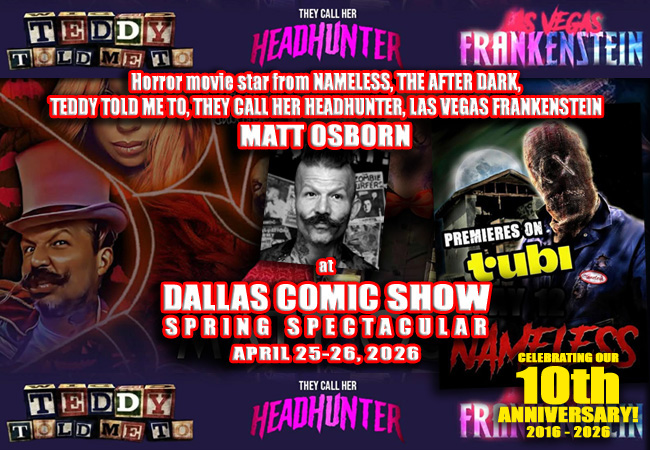 We’re happy to welcome our friend Matt Osborn to the show, who has starred in horror films THE AFTER DARK, TEDDY TOLD ME TO, THEY CALL HER HEADHUNTER, and LAS VEGAS FRANKENSTEIN. He can soon be seen in the TUBI movie NAMELESS this May. Matt has worked with incredible talent in the entertainment industry, and we’re thrilled to see him popping up more and more in the horror film genre. Be sure and stop by his table to find out more about his work at DALLAS COMIC SHOW’s Spring Spectacular this April 25-26, 2026!