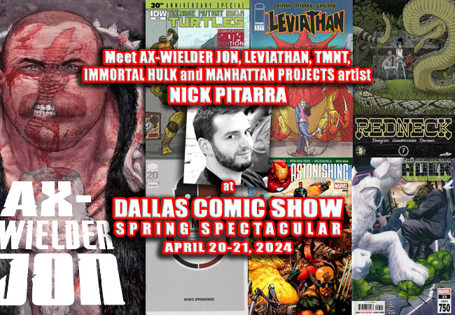You’ve seen his incredible artwork on books like RED WING, MANHATTAN PROJECTS, ASTONISHING TALES, TEENAGE MUTANT NINJA TURTLES, IMMORTAL HULK, LEVIATHAN, and more. His new crowdfunded book AX-WIELDER JON is wowing folks, and impressing readers and retailers, becoming a must-own graphic novel and garnering amazing praise from industry professionals. Help us welcome our friend Nick Pitarra back for DALLAS COMIC SHOW’s Spring Spectacular this April 20-21, 2024! He’ll have some copies of AX-WIELDER JON available for purchase in case you missed it, so don’t miss your chance to grab a copy at the show.