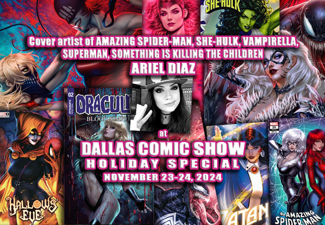 You’ve seen her amazing covers on books like THE BOYS, G.I. JOE, SOMETHING IS KILLING THE CHILDREN, TAARNA, VAMPIRELLA, VANISH, and more. She just recently turned in amazing cover art for SHE-HULK, HARLEY QUINN, AMAZING SPIDER-MAN and HALLOWS’ EVE to boot. She’s quickly become a fan-favorite among comic book collectors, and we expect you’ll be seeing her art more and more on HOT books in the next few years. Help us welcome back the very lovely and talented Ariel Diaz to DALLAS COMIC SHOW’s “Holiday Special” this November 23-24, 2024 at The Vista Mall (formerly Music City Mall) in Lewisville! Ariel’s covers are selling out left and right, and she’s someone you better buy some art or a print from now while it’s still doable. We love having her at our events, so don’t miss your chance to meet her in November.