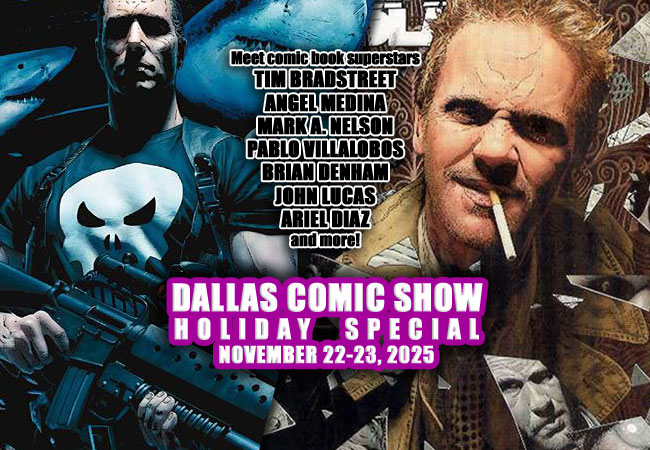 Yep, we’re back! DALLAS COMIC SHOW is once again hosting a Holiday Special this November 22-23, 2025, back at The Vista Mall and back inside the very nice CITITrends space upstairs from the Cinemark Theater. We’re bringing in a bunch of awesome comic book creators and cool celebrity guests, and it’s going to be a phenomenal show the whole family can enjoy. As we kick things off, we’re very excited to bring back the fan-favorite artist Tim Bradstreet this November – his first time back in DFW since 2018! Tim took a hiatus from con appearances for a bit these past several years, but we’re honored to have him join us for the upcoming event. We’ll also see return appearances by superstar cover artists Pablo Villalobos and Ariel Diaz, former SPAWN and KISS artist Angel Medina, Dark Horse’s original ALIENS and GODZILLA artist Mark A. Nelson, DEADPOOL artist John Lucas, and NOVA and X-FILES artist Brian Denham… and that’s just the starter list! Don’t miss this show, advance tickets will be on sale soon, and we’ll once again be offering our killer VIP package for a very affordable price. Mark your calendars and stay tuned for more info… and please, spread the word!