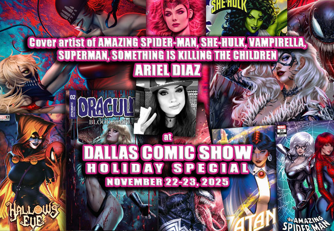 You’ve seen her amazing covers on books like THE BOYS, G.I. JOE, SOMETHING IS KILLING THE CHILDREN, TAARNA, VAMPIRELLA, VANISH, and more. She just recently turned in amazing cover art for SHE-HULK, HARLEY QUINN, AMAZING SPIDER-MAN and HALLOWS’ EVE to boot. She’s quickly become a fan-favorite among comic book collectors, and we expect you’ll be seeing her art more and more on HOT books in the next few years. Help us welcome back the very lovely and talented Ariel Diaz to DALLAS COMIC SHOW’s “Holiday Special” this November 22-23, 2025 at The Vista Mall (formerly Music City Mall) in Lewisville! Ariel’s covers are selling out left and right, and she’s someone you better buy some art or a print from now while it’s still doable. We love having her at our events, so don’t miss your chance to meet her in November.