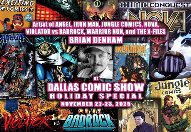 You’ve seen his work on books like VIOLATOR vs. BADROCK (written by Alan Moore!), WARRIOR NUN, ANGEL, THE DARKNESS, GREEN HORNET, IRON MAN: HYPERVELOCITY, NOVA, THUNDERBOLTS, WONDER WOMAN and THE X-FILES comics. His recent credits include Antarctic Press titles like EXCITING COMICS and JUNGLE COMICS. Help us welcome the talented Brian Denham to our guest list for DALLAS COMIC SHOW’s Holiday Special this November 22-23, 2025 at The Vista Mall in Lewisville! Be sure to stop by and get one of his stellar commissions!