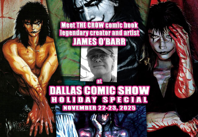 We’re excited to announce that the one and only James O’Barr will once again be attending Dallas Comic Show as a special guest at DALLAS COMIC SHOW’s Holiday Special this November 22-23, 2025 at The Vista Mall (formerly Music City Mall) in Lewisville, TX. James is the highly-respected creator and artist of THE CROW comic book series, which has spawned four movies and a television series, statues and action figures. In 2019 we celebrated the 25th Anniversary of THE CROW movie starring Brandon Lee, and the character and comic book’s 30th Anniversary with a special appearance and screening of the movie with James, so if you missed out on that show, make sure to come see him this time! There was a new big screen reboot just hit this past year, and in 2024 we celebrated the 30th Anniversary of the original film being released in theaters. We’re always honored to have Mr. O’Barr on the guest list for our events, so please make an effort to swing by his booth and say hello.