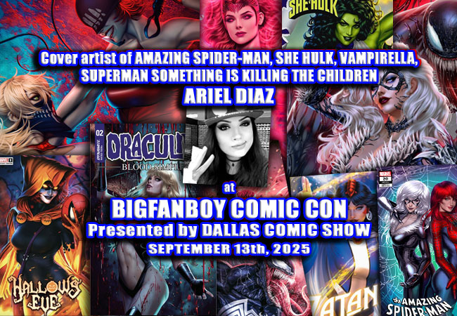 You’ve seen her amazing covers on books like THE BOYS, G.I. JOE, SOMETHING IS KILLING THE CHILDREN, TAARNA, VAMPIRELLA, VANISH, and more. She just recently turned in amazing cover art for SHE-HULK, HARLEY QUINN, AMAZING SPIDER-MAN and HALLOWS’ EVE to boot. She’s quickly become a fan-favorite among comic book collectors, and we expect you’ll be seeing her art more and more on HOT books in the next few years. Help us welcome back the very lovely and talented Ariel Diaz to BIGFANBOY COMIC CON presented by Dallas Comic Show this September 13th, 2025 at The Vista Mall (formerly Music City Mall) in Lewisville! Ariel’s covers are selling out left and right, and she’s someone you better buy some art or a print from now while it’s still doable. We love having her at our events, and she’s cutting back on a lot of her convention appearances lately, so don’t miss your chance to meet her in September.