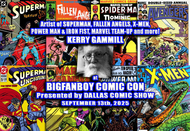 He’s the legendary artist of POWER MAN / IRON FIST, INDIANA JONES, MARVEL TEAM-UP, UNCANNY X-MEN and DEADLY FOES OF SPIDER-MAN at Marvel Comics. His DC Comics work includes ACTION COMICS, SUPERMAN, SUPERGIRL, POWER GIRL and TEEN TITANS. We’re very happy to welcome the one and only Kerry Gammill to BIGFANBOY COMIC CON presented by Dallas Comic Show this September 13th, 2025 at The Vista Mall in Lewisville. Kerry has also produced self-published works, including amazing projects in conjunction with the Bela Lugosi estate. Ask him about his horror comics, and his love for classic horror films. Did you know Kerry drew the now classic X-MEN AT THE STATE FAIR OF TEXAS comic book?