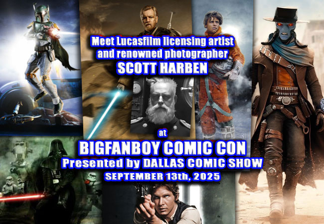 His work has been seen on a wide variety of theatrical poster campaigns, including Robert Rodriguez’s SPY KIDS and THE PUNISHER. He’s also provided licensing art for Lucasfilm and STAR WARS products and advertising campaigns, and is considered my many to be one of the most respected photographers in the DFW area. Help us welcome Scott Harben to our growing guest list for BIGFANBOY COMIC CON presented by Dallas Comic Show this September 13th, 2025 at The Vista Mall in Lewisville! Scott’s work has also been featured at STAR WARS CELEBRATION, where he debuted exclusive art prints. He’ll be offering stunning art and prints at the show to fit every price point.