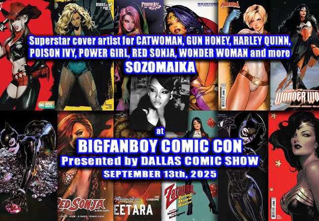 Yep, we’re having her back! Our November show was her only Dallas convention appearance for the second half of 2024, and we had her scheduled to appear in December, but she had to cancel due to an emergency… but she’s making up for that by joining our April show, so don’t miss this rare opportunity. She’s known for her incredibly hot covers on books like ALICE NEVER AFTER, BATMAN VS ROBIN, BIRDS OF PREY, CATWOMAN, CHEETARA, G.I. JOE, GUN HONEY, HARLEY QUINN, NUBIA, PENTHOUSE COMICS, POISON IVY, POWER GIRL, PUNCHLINE, RED SONJA, VAMPIRELLA, WONDER WOMAN, ZATANNA and more. We’re extremely excited to welcome the incredible Sozomaika to her second exciting convention with us, and you can meet her at BIGFANBOY COMIC CON presented by Dallas Comic Show this September 13th, 2025 at The Vista Mall in Lewisville, TX! Don’t miss this exciting chance to meet one of the hottest new talents in comics.