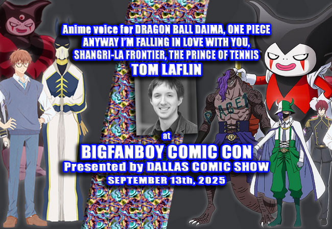 Anime voice actor Tom Laflin is know for roles like King Gomah in DRAGONBALL DAIMA, Page One in ONE PIECE, Shugo in ANYWAY I’M FALLING IN LOVE WITH YOU, Anubis in SACRIFICIAL PRINCESS AND THE KING OF BEASTS, Kasha in THE DEMON PRINCE OF MOMOCHI HOUSE, Reiji in SHANGRI-LA FRONTIER, Hitouji in THE PRINCE OF TENNIS, Yajirobe Ueno in TRIBE NINE, and more. Come meet Tom at BIGFANBOY COMIC CON presented by Dallas Comic Show this September 13th, 2025! Appearing courtesy of Powell Talent.